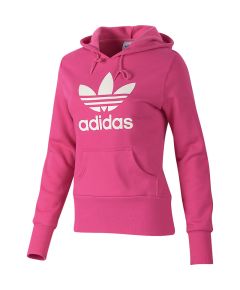 This classic women's adidas Originals Trefoil Logo Hoodie is made of comfortable fleece with a drawcord hood, a kangaroo pocket and an outsize logo. The pullover hoodie also features extra-long cuffs and hem for feminine style.